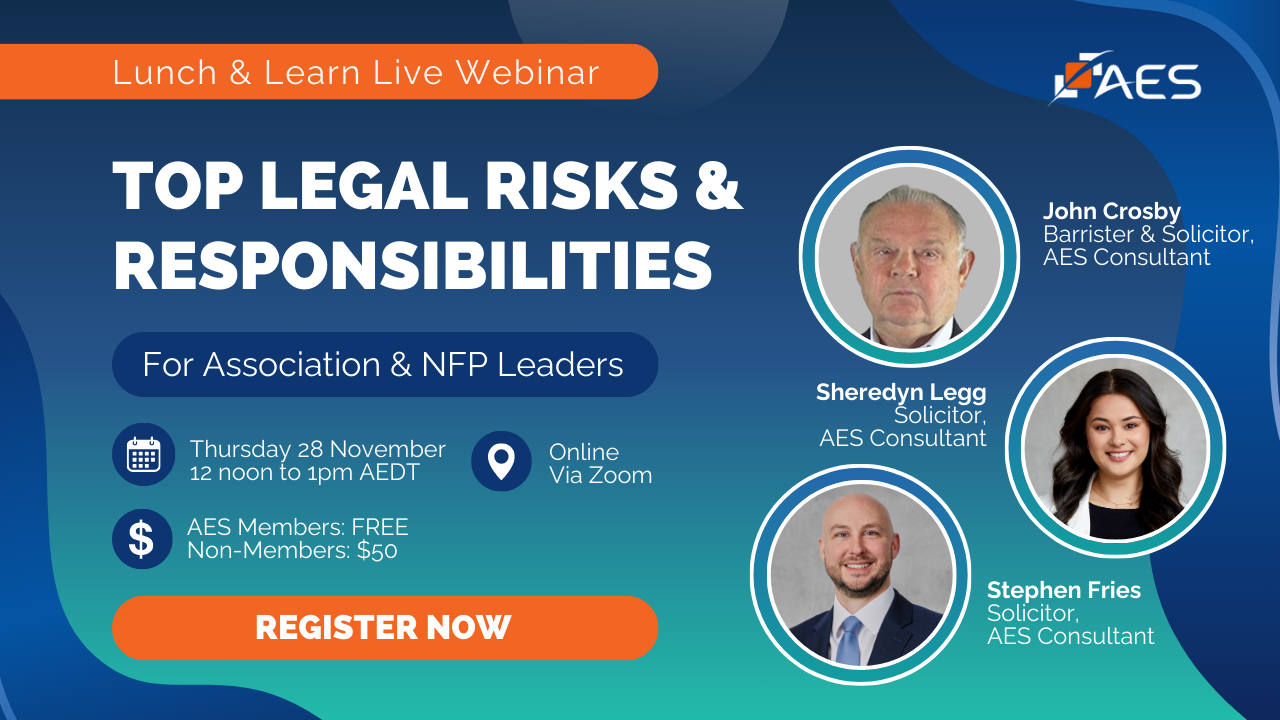 Our next webinar AES have invited our AES Legal Practitioners who will address some of the key governance legal issues from our research they include: